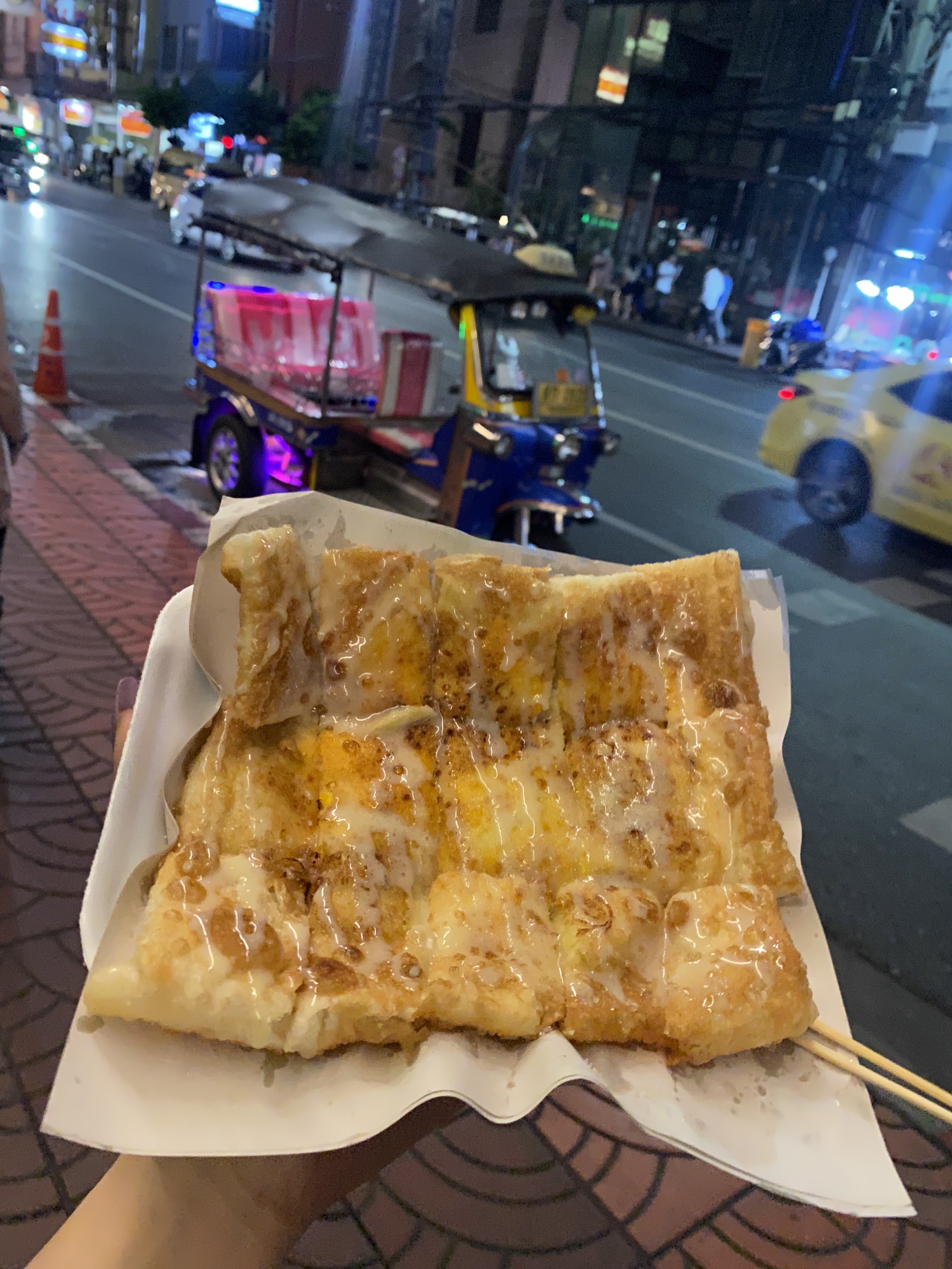 + Bánh Prata chuối: Là một kiểu bánh đơn giản được rưới sữa đặc cùng siro chocolate mang lại một hương vị ngọt ngào từ sữa, món bánh trở nên được yêu thích phổ biến hơn. Hương vị của món ăn này được người dân Thái cũng như khách du lịch vô cùng yêu thích. Bạn có thể dễ dàng bắt gặp hàng trăm xe bán món banh này ở bất cứ dọc đường nào. Đặc biệt buổi tối ở China Town vô cùng nhiều xe bán món bánh này, sau khi thưởng thức bữa tối tại China Town bạn có thể mua ngay một phần bánh prata chuối vừa ăn vừa tản bộ, một trải nghiệm vô cùng thú vị sẽ khiến bạn thích thú.
