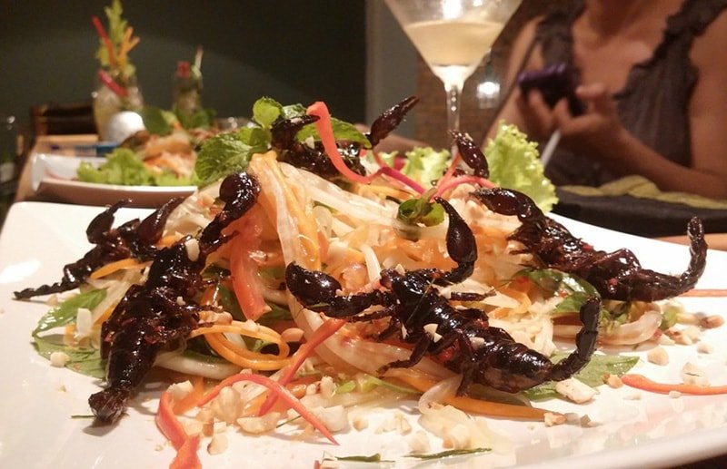 Theo người Campuchia, các món ăn côn trùng được xem là thức ăn có giá trị dinh dưỡng cao và đặc biệt được người đầu bếp chế biến rất kỹ lưỡng nên du khách có thể thưởng món salad bò cạp hoặc các món khác khá thoải mái và ngon miệng.