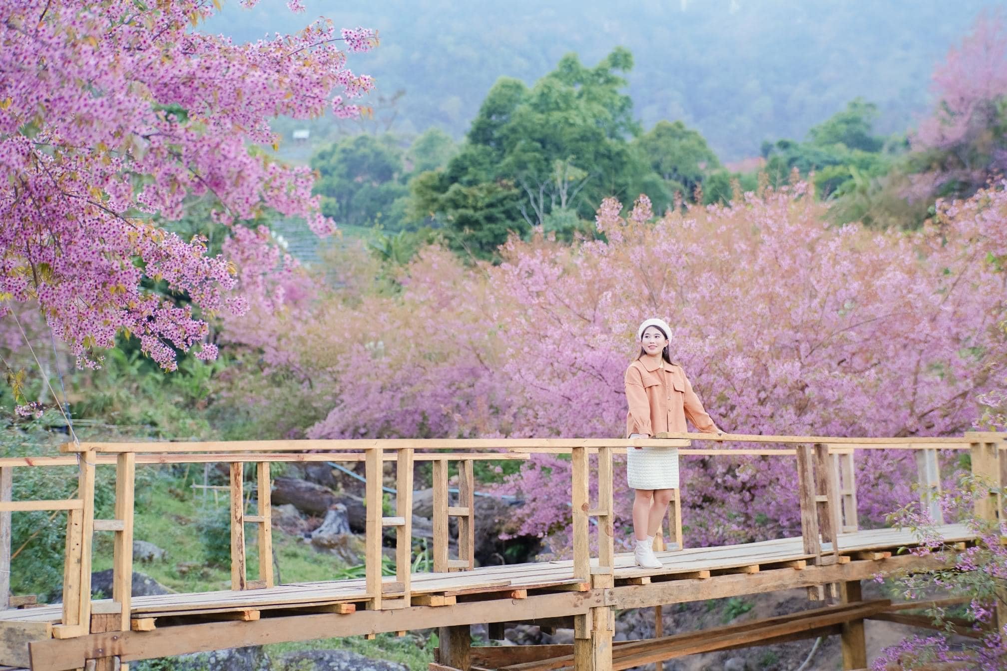 Nằm trong vườn quốc gia Doi Inthanon hoa đào nơi đây nở rộ nổi bật màu hồng thắm, nổi bật giữa bầu trời trong xanh và các thác nước hùng vĩ. Bạn có thể thực hiện ước mơ đi bộ dưới tán hoa anh đào ở Khun Wang. Khu vực này sẽ biến thành một biển sắc màu hồng khi nở rộ, đây chắc chắn là một cảnh tượng khó quên.